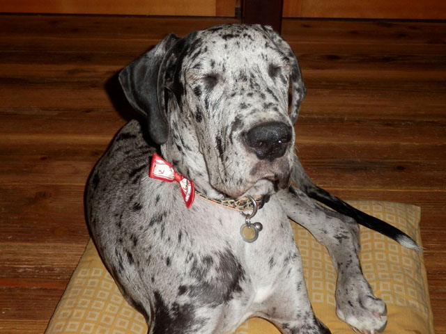 りぼん(二代目) グレートデーン わんぱく、やんちゃ、わる坊主 2013年4月16日生まれの当家の三女。名前は前のりぼんと同じで「リボンの騎士」の主人公、サファイア王女から。今はぴのこ姉ちゃんととうちゃん、かあちゃんの4人で布団で寝ています。