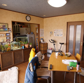 キッチンの解体前の状態を見てみる。 壊す前の我が家のキッチンです。キッチンとリビングが二間続きの形になっていました。もとのキッチンは二世帯分離で母親のものになり、壁の向こうのスペースになりました。で、リビングの方にダイニングキッチンを作ります。これまでよりも小さくなりますが、使うのは夫婦二人だけなので、充分です。そのかわり、意匠と空間利用に工夫をこらすように計画しました。